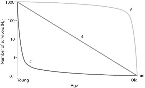 In the effigy in a higher place, which of the following survivorship curves implies that an brute may lay many eggs, of which a regular number die each twelvemonth on a logarithmic scale?